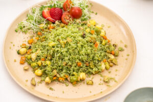 A perfect dish is one that I can eat and present according to my preferences, what are your preferences? You can freely arrange it on this plate. With the eye-catching green color of rainbow fried rice, I will put it on a plate, sprinkle some pepper and decorate it with some coriander on top, with some cucumber, tomato or nuts on the side.
